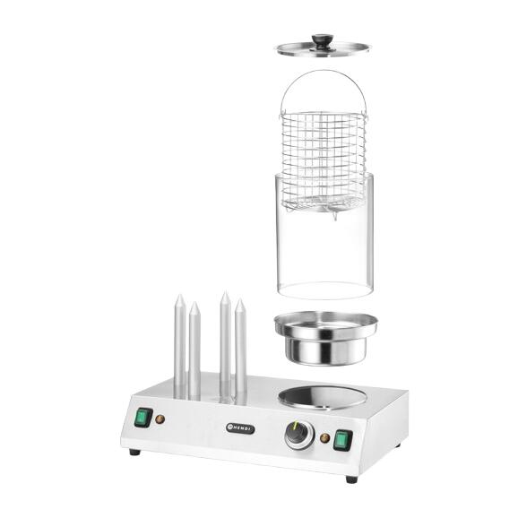 Корпус, кошница с разделител и капак от неръждаема стомана. Нагревателни пръчки за хлебчета от алуминий с размери: Ø25x(L)198мм. Защитен цилиндър, изработен от стъкло. Кошница за колбаси с размери ø175 мм, за колбаси с дължина до 24 см. Капацитет на контейнера за вода: 1 л Светлинен индикатор за нагряване. Защита от прегряване. Регулируема температура до 100°C.