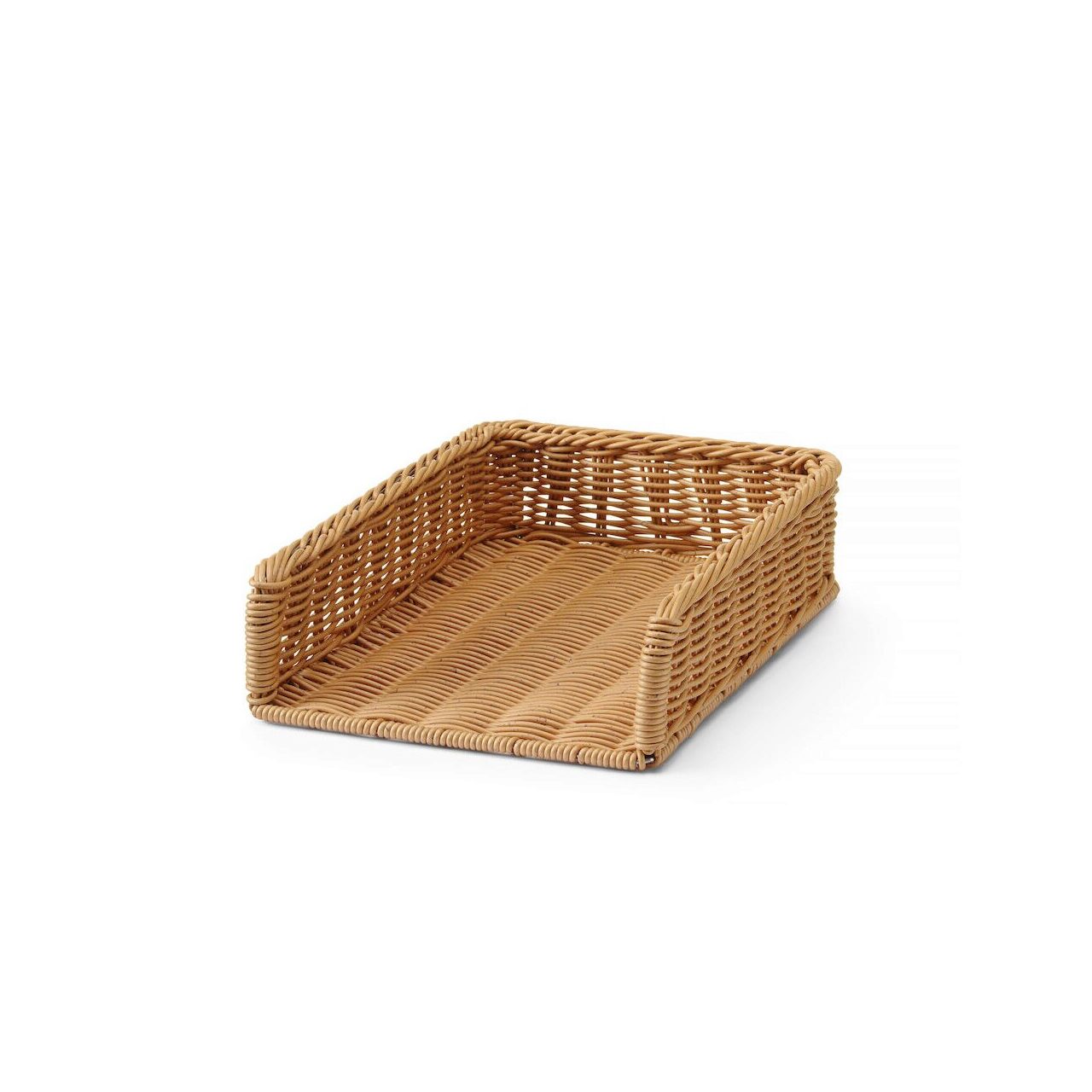 Кошница с големи размери – идеална за показване на хляб и други печива в пекарни, хранителни магазини и бюфети. Изработена от полиратан, подсилен с рамка от неръждаема стомана. Може да се мие в съдомиялна машина