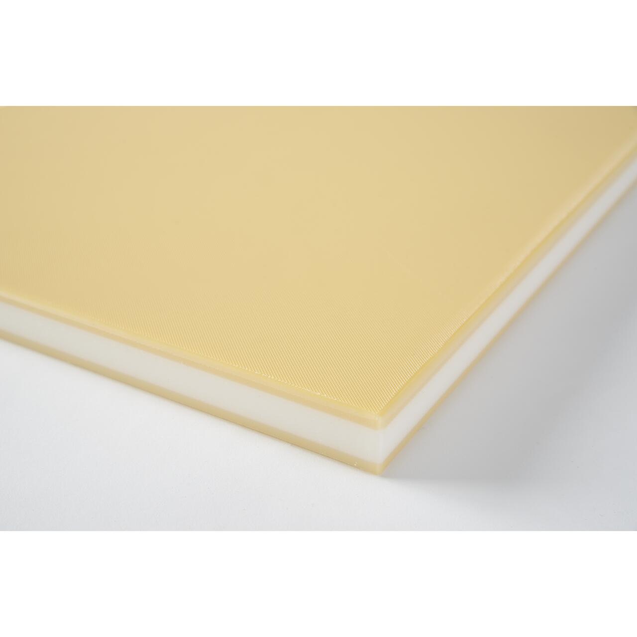 Изработена от пластмаса (PB еластомер) с вътрешно дървено ядро, защитено с полиетилен (PE). Антибактериални свойства. 30% по-лека от пластмасовите табли. Дървената сърцевина предотвратява изкривяването и гарантира издръжливостта на таблата. Екологичен производствен процес – намаляване на пластмасата. Може да се мие в съдомиялна машина